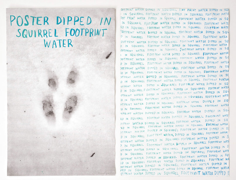 Poster Dipped in Squirrel Footprint Water is a limited edition poster hand-dipped by the artist in water made from melted squirrel foot prints in snow. Part of a series of artworks capturing traces and trails of animals in the artist's neighborhood.